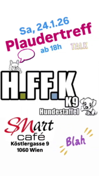 H.FF.K. K9 Hundestaffel Plaudertreff, Samstag, 24.1.2026 ab 18:00 Uhr im ersten Raum im SMart Cafe (im restlichen Lokal gleichzeitig ab 17 Uhr Normalbetrieb für alle)