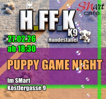 Puppy Game Night, Freitag, 27.2.2026 ab 18:30 Uhr im zweiten Raum und in der Kammer im SMart Cafe (im restlichen Lokal gleichzeitig ab 17 Uhr Normalbetrieb für alle)