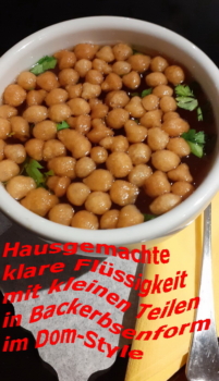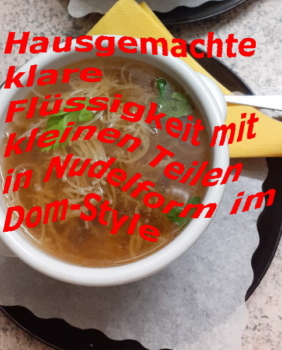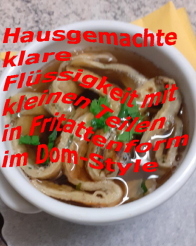Hausgemachte klare Flüssigkeit mit kleinen Teilen in Frittaten- oder Nudel- oder Backerbsen- oder Grießnockerlform im Dom– oder Sub-Style